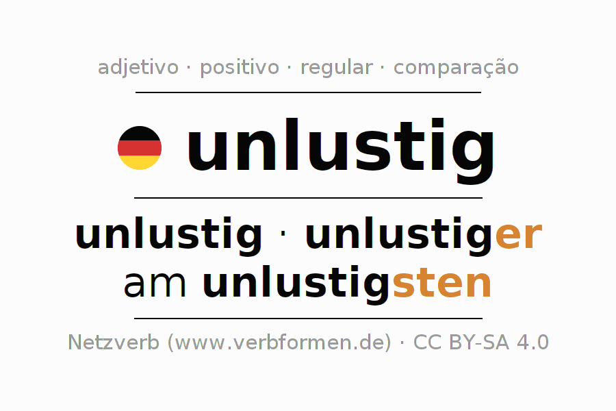 A declinação do adjetivo unlustig (sem graça, desagradável) utiliza as seguintes formas de comparação unlustig,unlustiger,am unlustigsten. As terminações para o comparativo e o superlativo são er/sten. O adjectivo unlustig pode ser utilizado tanto como atributivo antes de um substantivo ou como predicativo junto com um verbo.Não se pode flexionar e comparar somente o adjetivo unlustig, mas sim todos os adjetivos em alemão. Comentários ☆