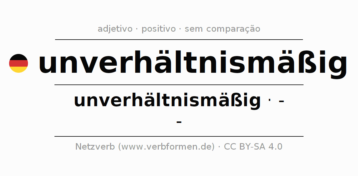 A declinação do adjetivo unverhältnismäßig não forma o grau de comparação unverhältnismäßig. O adjectivo não tem forma no comparativo e nem no superlativo. O adjectivo unverhältnismäßig pode ser utilizado tanto como atributivo antes de um substantivo ou como predicativo junto com um verbo.Não se pode flexionar e comparar somente o adjetivo unverhältnismäßig, mas sim todos os adjetivos em alemão. Comentários ☆