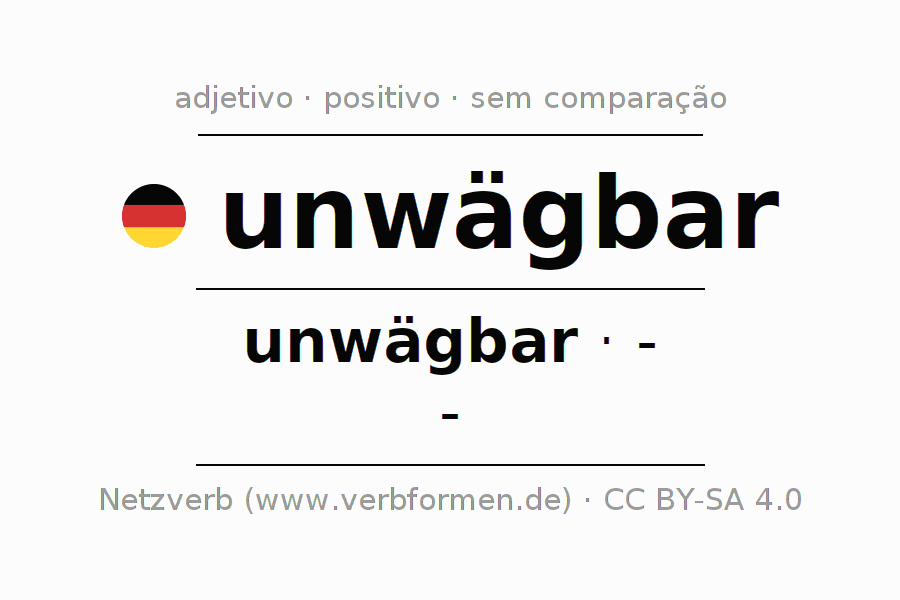 A declinação do adjetivo unwägbar não forma o grau de comparação unwägbar. O adjectivo não tem forma no comparativo e nem no superlativo. O adjectivo unwägbar pode ser utilizado tanto como atributivo antes de um substantivo ou como predicativo junto com um verbo.Não se pode flexionar e comparar somente o adjetivo unwägbar, mas sim todos os adjetivos em alemão. Comentários ☆
