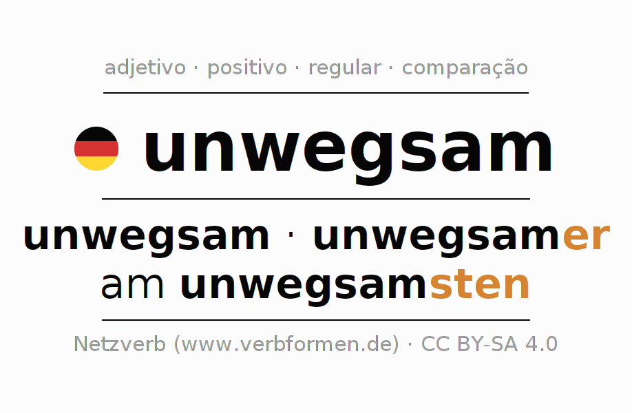 A declinação do adjetivo unwegsam (de difícil acesso, intransitável) utiliza as seguintes formas de comparação unwegsam,unwegsamer,am unwegsamsten. As terminações para o comparativo e o superlativo são er/sten. O adjectivo unwegsam pode ser utilizado tanto como atributivo antes de um substantivo ou como predicativo junto com um verbo.Não se pode flexionar e comparar somente o adjetivo unwegsam, mas sim todos os adjetivos em alemão. Comentários ☆