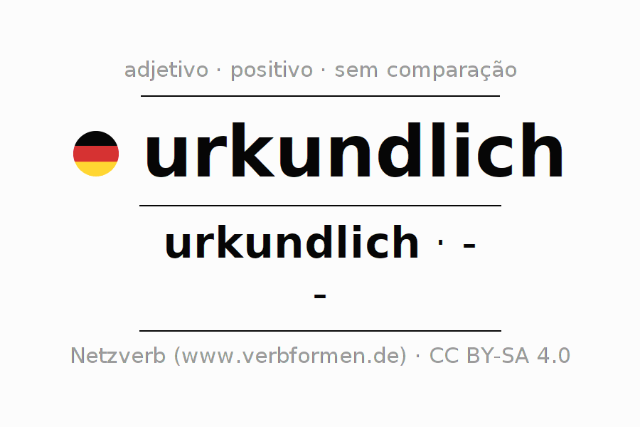 A declinação do adjetivo urkundlich não forma o grau de comparação urkundlich. O adjectivo não tem forma no comparativo e nem no superlativo. O adjectivo urkundlich pode ser utilizado tanto como atributivo antes de um substantivo ou como predicativo junto com um verbo.Não se pode flexionar e comparar somente o adjetivo urkundlich, mas sim todos os adjetivos em alemão. Comentários ☆