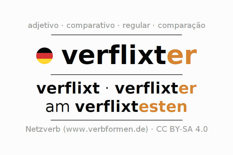 A declinação do adjetivo verflixter (maldito, danado) utiliza as seguintes formas de comparação verflixt,verflixter,am verflixtesten. As terminações para o comparativo e o superlativo são er/esten. O adjectivo verflixter pode ser utilizado tanto como atributivo antes de um substantivo ou como predicativo junto com um verbo.Não se pode flexionar e comparar somente o adjetivo verflixter, mas sim todos os adjetivos em alemão. Comentários ☆