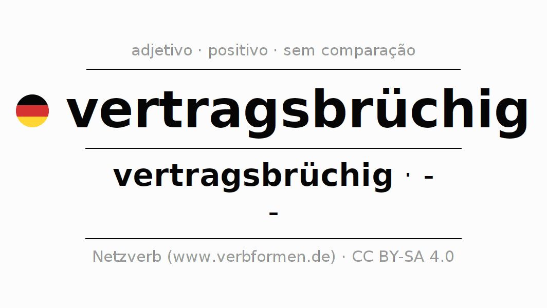 A declinação do adjetivo vertragsbrüchig não forma o grau de comparação vertragsbrüchig. O adjectivo não tem forma no comparativo e nem no superlativo. O adjectivo vertragsbrüchig pode ser utilizado tanto como atributivo antes de um substantivo ou como predicativo junto com um verbo.Não se pode flexionar e comparar somente o adjetivo vertragsbrüchig, mas sim todos os adjetivos em alemão. Comentários ☆