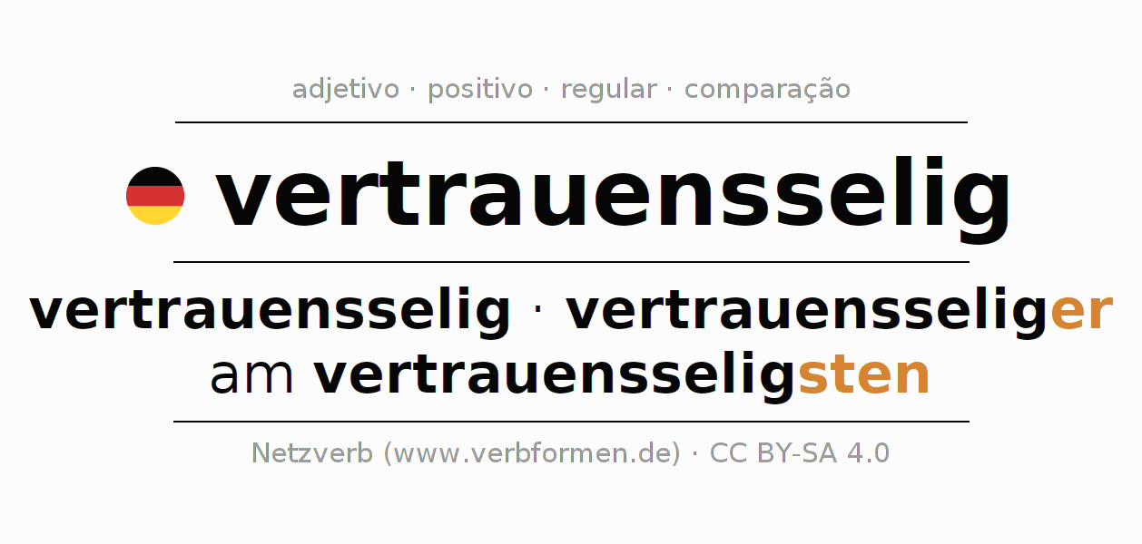 A declinação do adjetivo vertrauensselig (ingênuo, creduloso) utiliza as seguintes formas de comparação vertrauensselig,vertrauensseliger,am vertrauensseligsten. As terminações para o comparativo e o superlativo são er/sten. O adjectivo vertrauensselig pode ser utilizado tanto como atributivo antes de um substantivo ou como predicativo junto com um verbo.Não se pode flexionar e comparar somente o adjetivo vertrauensselig, mas sim todos os adjetivos em alemão. Comentários ☆