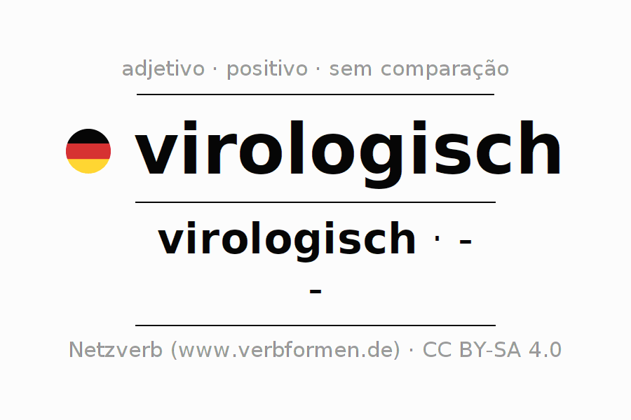 A declinação do adjetivo virologisch não forma o grau de comparação virologisch. O adjectivo não tem forma no comparativo e nem no superlativo. O adjectivo virologisch pode ser utilizado tanto como atributivo antes de um substantivo ou como predicativo junto com um verbo.Não se pode flexionar e comparar somente o adjetivo virologisch, mas sim todos os adjetivos em alemão. Comentários ☆