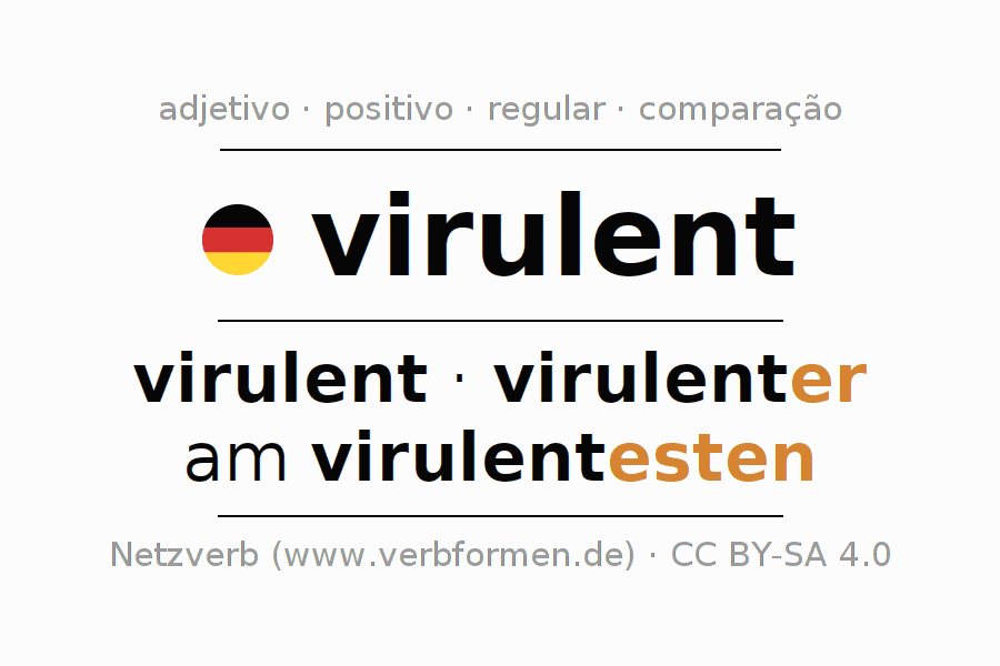 A declinação do adjetivo virulent (agitado, contagioso) utiliza as seguintes formas de comparação virulent,virulenter,am virulentesten. As terminações para o comparativo e o superlativo são er/esten. O adjectivo virulent pode ser utilizado tanto como atributivo antes de um substantivo ou como predicativo junto com um verbo.Não se pode flexionar e comparar somente o adjetivo virulent, mas sim todos os adjetivos em alemão. Comentários ☆