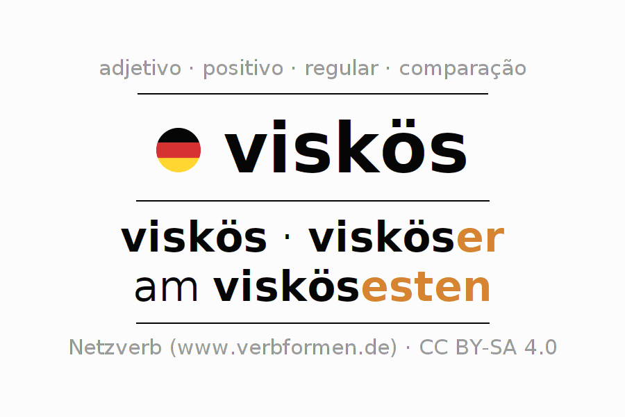 A declinação do adjetivo viskös (viscoso) utiliza as seguintes formas de comparação viskös,visköser,am viskösesten. As terminações para o comparativo e o superlativo são er/esten. O adjectivo viskös pode ser utilizado tanto como atributivo antes de um substantivo ou como predicativo junto com um verbo.Não se pode flexionar e comparar somente o adjetivo viskös, mas sim todos os adjetivos em alemão. Comentários ☆