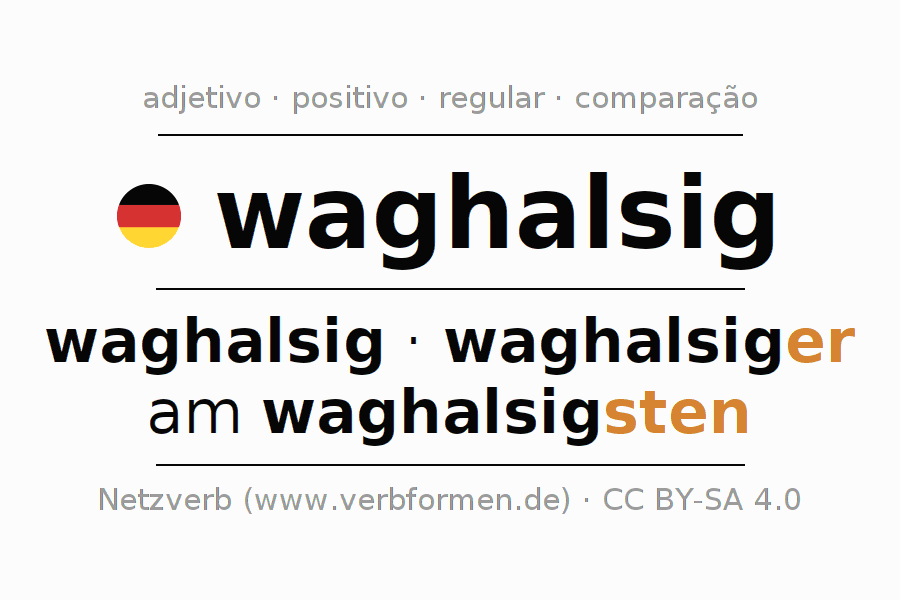 A declinação do adjetivo waghalsig (audacioso, corajoso) utiliza as seguintes formas de comparação waghalsig,waghalsiger,am waghalsigsten. As terminações para o comparativo e o superlativo são er/sten. O adjectivo waghalsig pode ser utilizado tanto como atributivo antes de um substantivo ou como predicativo junto com um verbo.Não se pode flexionar e comparar somente o adjetivo waghalsig, mas sim todos os adjetivos em alemão. Comentários ☆