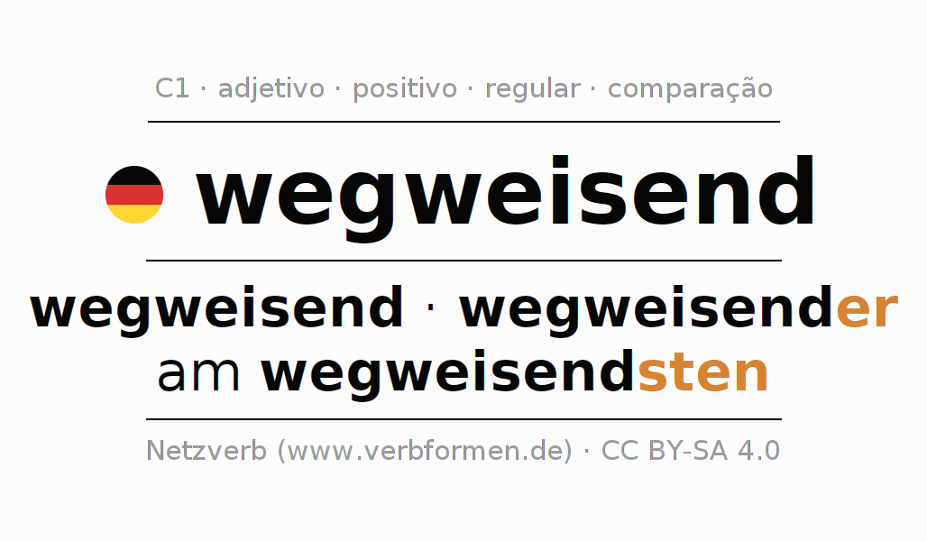 A declinação do adjetivo wegweisend (direcionador, inovador) utiliza as seguintes formas de comparação wegweisend,wegweisender,am wegweisendsten. As terminações para o comparativo e o superlativo são er/sten. O adjectivo wegweisend pode ser utilizado tanto como atributivo antes de um substantivo ou como predicativo junto com um verbo.Não se pode flexionar e comparar somente o adjetivo wegweisend, mas sim todos os adjetivos em alemão. Comentários ☆