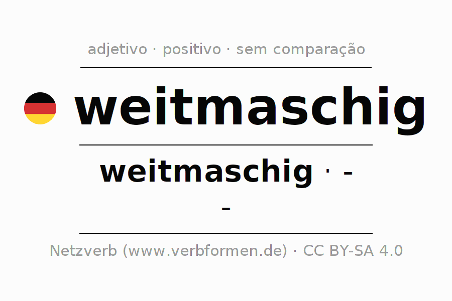 A declinação do adjetivo weitmaschig não forma o grau de comparação weitmaschig. O adjectivo não tem forma no comparativo e nem no superlativo. O adjectivo weitmaschig pode ser utilizado tanto como atributivo antes de um substantivo ou como predicativo junto com um verbo.Não se pode flexionar e comparar somente o adjetivo weitmaschig, mas sim todos os adjetivos em alemão. Comentários ☆