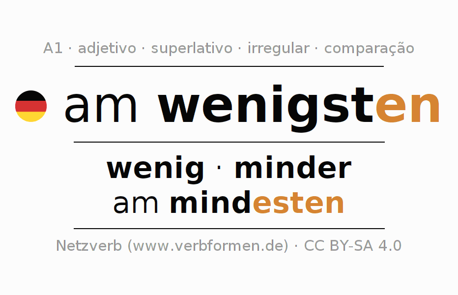 A declinação do adjetivo am wenigsten (pouco, escasso) utiliza as seguintes formas de comparação wenig,minder,am mindesten. As terminações para o comparativo e o superlativo são -/sten. O adjectivo am wenigsten pode ser utilizado tanto como atributivo antes de um substantivo ou como predicativo junto com um verbo.Não se pode flexionar e comparar somente o adjetivo am wenigsten, mas sim todos os adjetivos em alemão. Comentários ☆