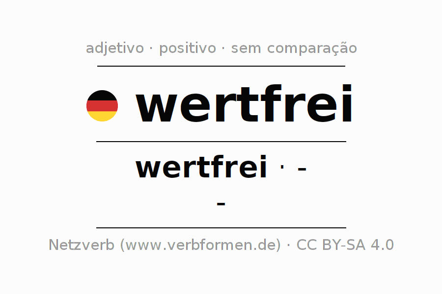 A declinação do adjetivo wertfrei não forma o grau de comparação wertfrei. O adjectivo não tem forma no comparativo e nem no superlativo. O adjectivo wertfrei pode ser utilizado tanto como atributivo antes de um substantivo ou como predicativo junto com um verbo.Não se pode flexionar e comparar somente o adjetivo wertfrei, mas sim todos os adjetivos em alemão. Comentários ☆