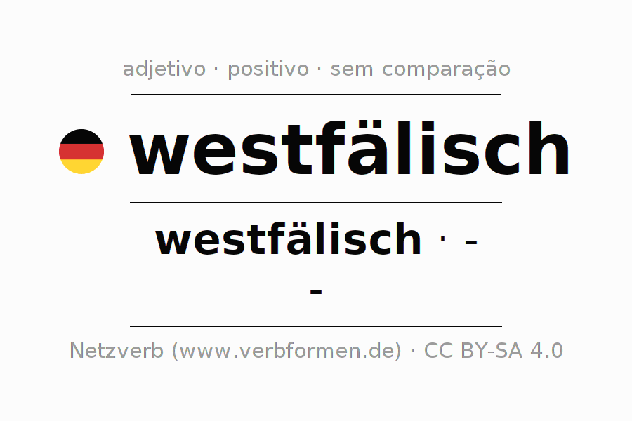 A declinação do adjetivo westfälisch não forma o grau de comparação westfälisch. O adjectivo não tem forma no comparativo e nem no superlativo. O adjectivo westfälisch pode ser utilizado tanto como atributivo antes de um substantivo ou como predicativo junto com um verbo.Não se pode flexionar e comparar somente o adjetivo westfälisch, mas sim todos os adjetivos em alemão. Comentários ☆