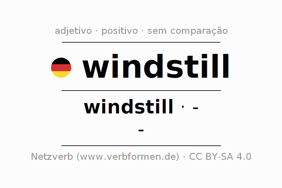 A declinação do adjetivo windstill não forma o grau de comparação windstill. O adjectivo não tem forma no comparativo e nem no superlativo. O adjectivo windstill pode ser utilizado tanto como atributivo antes de um substantivo ou como predicativo junto com um verbo.Não se pode flexionar e comparar somente o adjetivo windstill, mas sim todos os adjetivos em alemão. Comentários ☆