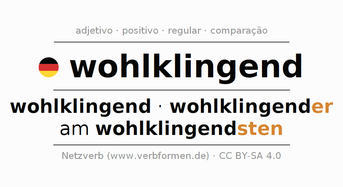 A declinação do adjetivo wohlklingend (harmonioso, melódico) utiliza as seguintes formas de comparação wohlklingend,wohlklingender,am wohlklingendsten. As terminações para o comparativo e o superlativo são er/sten. O adjectivo wohlklingend pode ser utilizado tanto como atributivo antes de um substantivo ou como predicativo junto com um verbo.Não se pode flexionar e comparar somente o adjetivo wohlklingend, mas sim todos os adjetivos em alemão. Comentários ☆