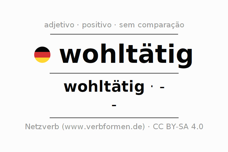 A declinação do adjetivo wohltätig não forma o grau de comparação wohltätig. O adjectivo não tem forma no comparativo e nem no superlativo. O adjectivo wohltätig pode ser utilizado tanto como atributivo antes de um substantivo ou como predicativo junto com um verbo.Não se pode flexionar e comparar somente o adjetivo wohltätig, mas sim todos os adjetivos em alemão. Comentários ☆