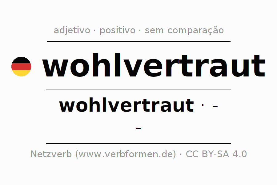 A declinação do adjetivo wohlvertraut não forma o grau de comparação wohlvertraut. O adjectivo não tem forma no comparativo e nem no superlativo. O adjectivo wohlvertraut pode ser utilizado tanto como atributivo antes de um substantivo ou como predicativo junto com um verbo.Não se pode flexionar e comparar somente o adjetivo wohlvertraut, mas sim todos os adjetivos em alemão. Comentários ☆