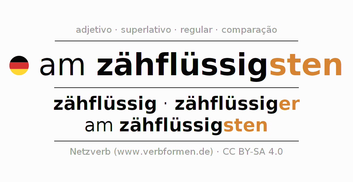 A declinação do adjetivo am zähflüssigsten (espesso, viscoso) utiliza as seguintes formas de comparação zähflüssig,zähflüssiger,am zähflüssigsten. As terminações para o comparativo e o superlativo são er/sten. O adjectivo am zähflüssigsten pode ser utilizado tanto como atributivo antes de um substantivo ou como predicativo junto com um verbo.Não se pode flexionar e comparar somente o adjetivo am zähflüssigsten, mas sim todos os adjetivos em alemão. Comentários ☆
