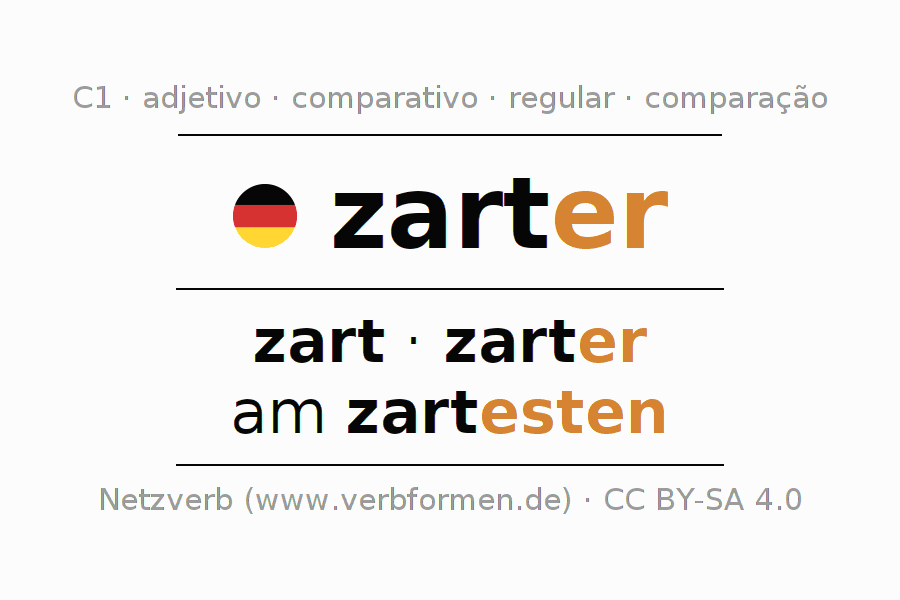 A declinação do adjetivo zarter (delicado, frágil) utiliza as seguintes formas de comparação zart,zarter,am zartesten. As terminações para o comparativo e o superlativo são er/esten. O adjectivo zarter pode ser utilizado tanto como atributivo antes de um substantivo ou como predicativo junto com um verbo.Não se pode flexionar e comparar somente o adjetivo zarter, mas sim todos os adjetivos em alemão. Comentários ☆