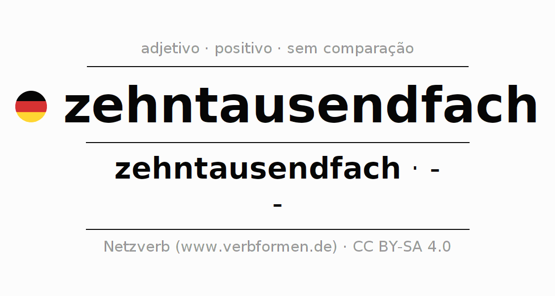 A declinação do adjetivo zehntausendfach não forma o grau de comparação zehntausendfach. O adjectivo não tem forma no comparativo e nem no superlativo. O adjectivo zehntausendfach pode ser utilizado tanto como atributivo antes de um substantivo ou como predicativo junto com um verbo.Não se pode flexionar e comparar somente o adjetivo zehntausendfach, mas sim todos os adjetivos em alemão. Comentários ☆