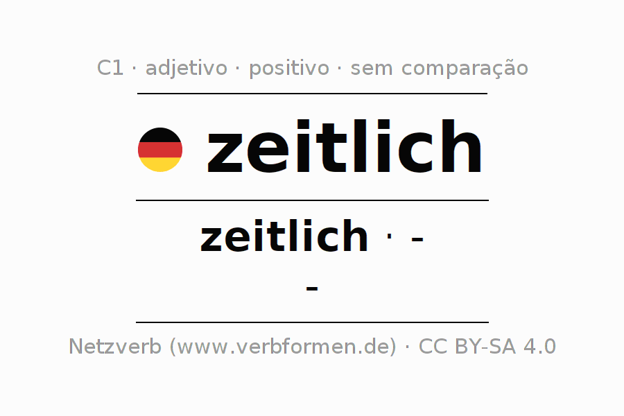 A declinação do adjetivo zeitlich não forma o grau de comparação zeitlich. O adjectivo não tem forma no comparativo e nem no superlativo. O adjectivo zeitlich pode ser utilizado tanto como atributivo antes de um substantivo ou como predicativo junto com um verbo.Não se pode flexionar e comparar somente o adjetivo zeitlich, mas sim todos os adjetivos em alemão. Comentários ☆