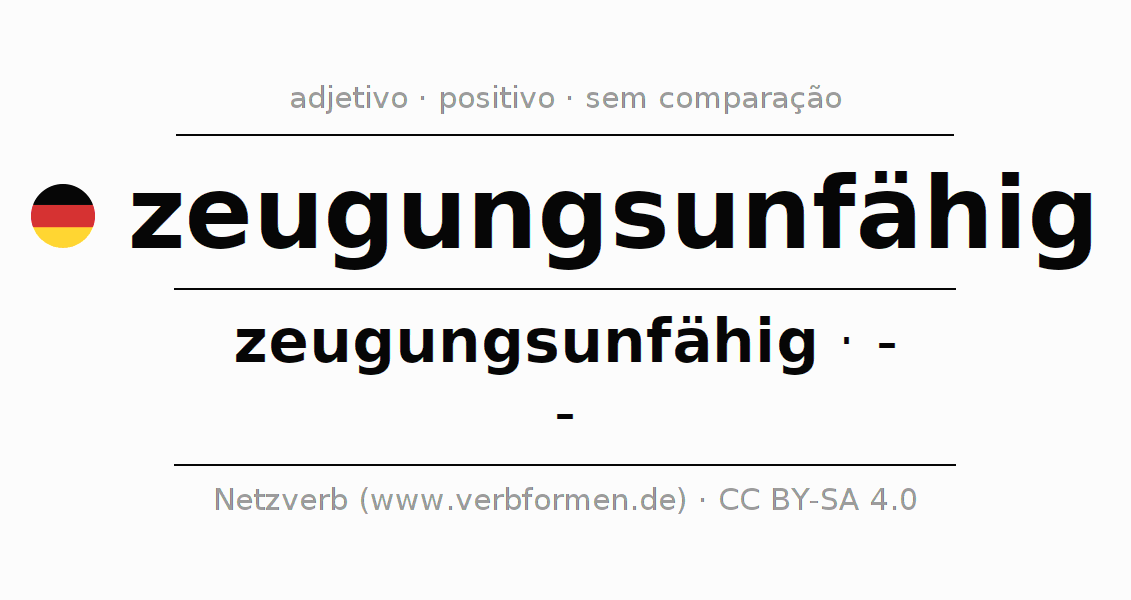 A declinação do adjetivo zeugungsunfähig não forma o grau de comparação zeugungsunfähig. O adjectivo não tem forma no comparativo e nem no superlativo. O adjectivo zeugungsunfähig pode ser utilizado tanto como atributivo antes de um substantivo ou como predicativo junto com um verbo.Não se pode flexionar e comparar somente o adjetivo zeugungsunfähig, mas sim todos os adjetivos em alemão. Comentários ☆