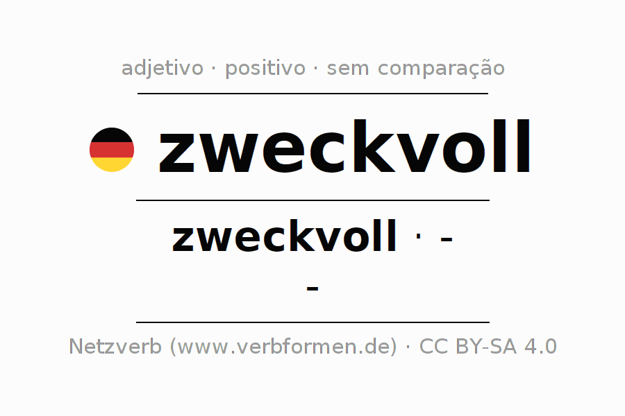 A declinação do adjetivo zweckvoll não forma o grau de comparação zweckvoll. O adjectivo não tem forma no comparativo e nem no superlativo. O adjectivo zweckvoll pode ser utilizado tanto como atributivo antes de um substantivo ou como predicativo junto com um verbo.Não se pode flexionar e comparar somente o adjetivo zweckvoll, mas sim todos os adjetivos em alemão. Comentários ☆