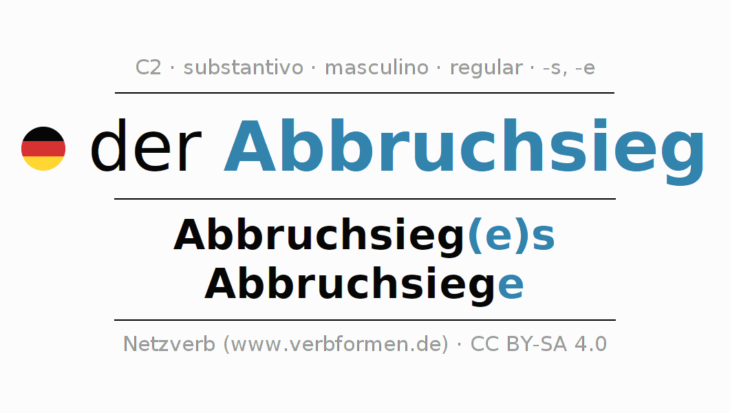 Declinação de Abbruchsieg é apresentada em uma tabela com todas as formas no singular e no plural (plural) e em todos os quatro casos: nominativo (1º caso), genitivo (2º caso), dativo (3º caso) e acusativo (4º caso) . Especialmente para os alunos de alemão, a correta declinação da palavra Abbruchsieg é fundamental.