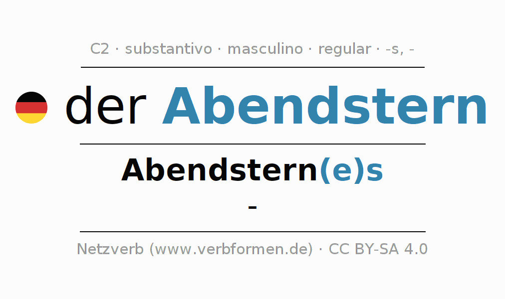 Declinação de Abendstern é apresentada em uma tabela com todas as formas no singular e no plural (plural) e em todos os quatro casos: nominativo (1º caso), genitivo (2º caso), dativo (3º caso) e acusativo (4º caso) . Especialmente para os alunos de alemão, a correta declinação da palavra Abendstern é fundamental.