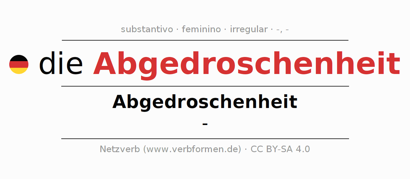 Declinação de Abgedroschenheit é apresentada em uma tabela com todas as formas no singular e no plural (plural) e em todos os quatro casos: nominativo (1º caso), genitivo (2º caso), dativo (3º caso) e acusativo (4º caso) . Especialmente para os alunos de alemão, a correta declinação da palavra Abgedroschenheit é fundamental.
