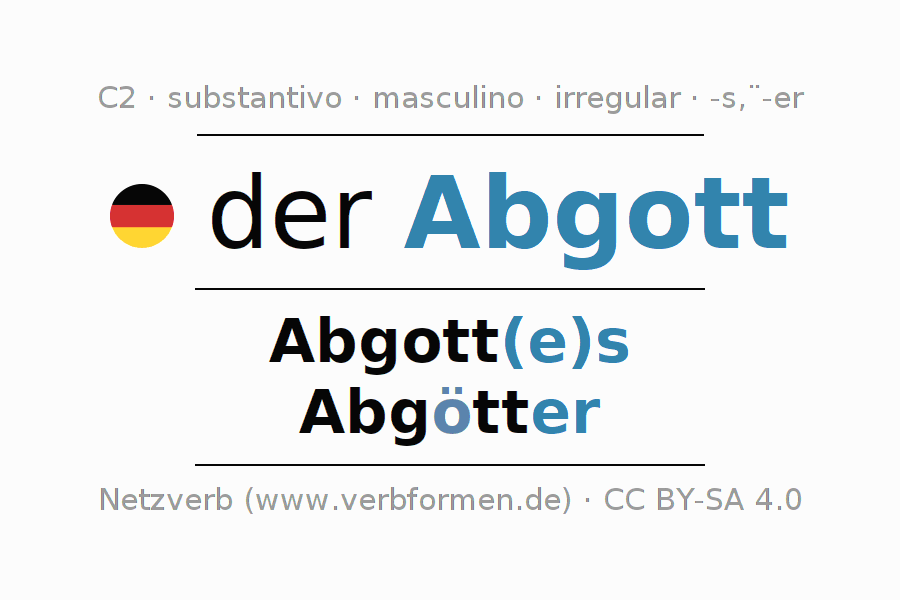 Declinação de Abgott é apresentada em uma tabela com todas as formas no singular e no plural (plural) e em todos os quatro casos: nominativo (1º caso), genitivo (2º caso), dativo (3º caso) e acusativo (4º caso) . Especialmente para os alunos de alemão, a correta declinação da palavra Abgott é fundamental.
