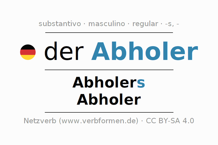 A declinação do substantivo Abholer (coletor, retirador) está no genitivo singular Abholers e no nominativo plural Abholer . O substantivo forte Abholer é declinado com a terminação s/-. O gênero gramatical de Abholer é masculino e o artigo definido é 'der'. Não se pode somente declinar o substantivo Abholer mas sim todos os substantivos em alemão. Comentários ☆