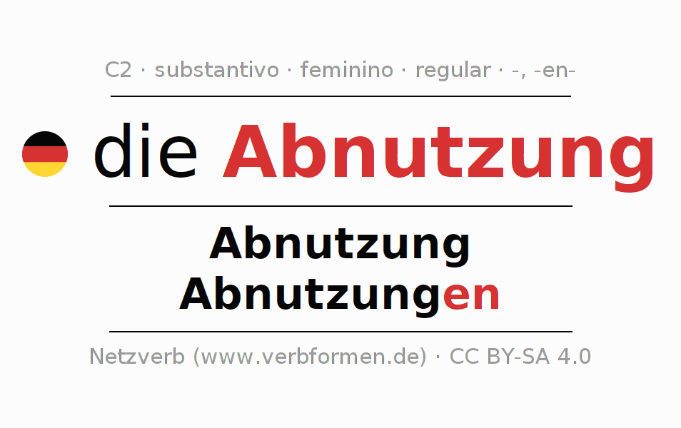 Declinação de Abnutzung é apresentada em uma tabela com todas as formas no singular e no plural (plural) e em todos os quatro casos: nominativo (1º caso), genitivo (2º caso), dativo (3º caso) e acusativo (4º caso) . Especialmente para os alunos de alemão, a correta declinação da palavra Abnutzung é fundamental.