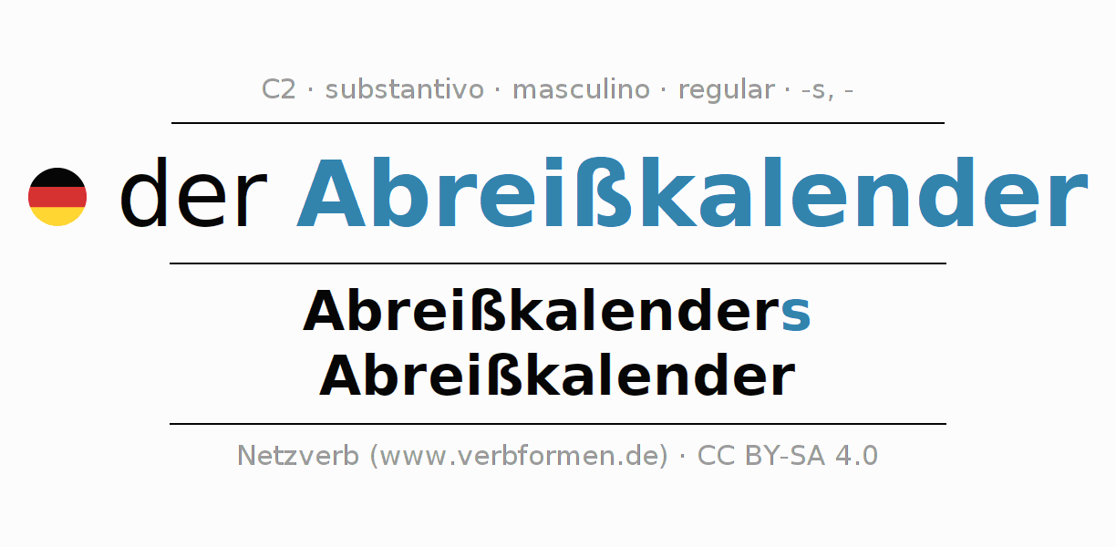 - Singular: der Abreißkalender, des Abreißkalenders, dem Abreißkalender, den Abreißkalender