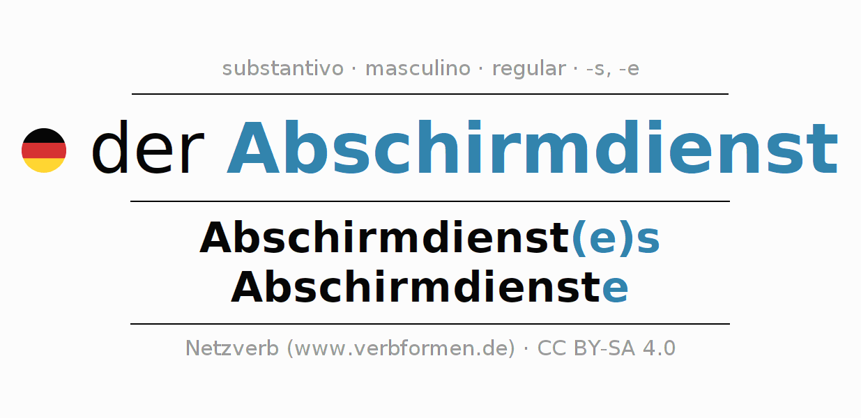 Declinação de Abschirmdienst é apresentada em uma tabela com todas as formas no singular e no plural (plural) e em todos os quatro casos: nominativo (1º caso), genitivo (2º caso), dativo (3º caso) e acusativo (4º caso) . Especialmente para os alunos de alemão, a correta declinação da palavra Abschirmdienst é fundamental.