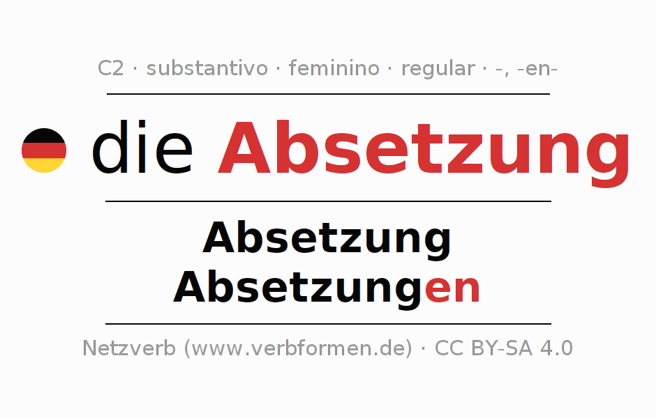 Declinação de Absetzung é apresentada em uma tabela com todas as formas no singular e no plural (plural) e em todos os quatro casos: nominativo (1º caso), genitivo (2º caso), dativo (3º caso) e acusativo (4º caso) . Especialmente para os alunos de alemão, a correta declinação da palavra Absetzung é fundamental.