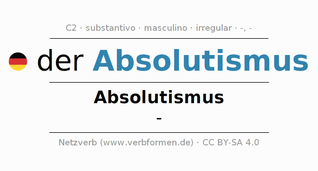A declinação do substantivo Absolutismus (absolutismo) está no genitivo singular Absolutismus e no nominativo plural - . O substantivo Absolutismus é declinado com as terminações -/-. Não há formas no plural. O gênero gramatical de Absolutismus é masculino e o artigo definido é 'der'. Não se pode somente declinar o substantivo Absolutismus mas sim todos os substantivos em alemão. O substantivo faz parte do vocabulário referente ao Certificado em Alemão do Nível C2. Comentários ☆