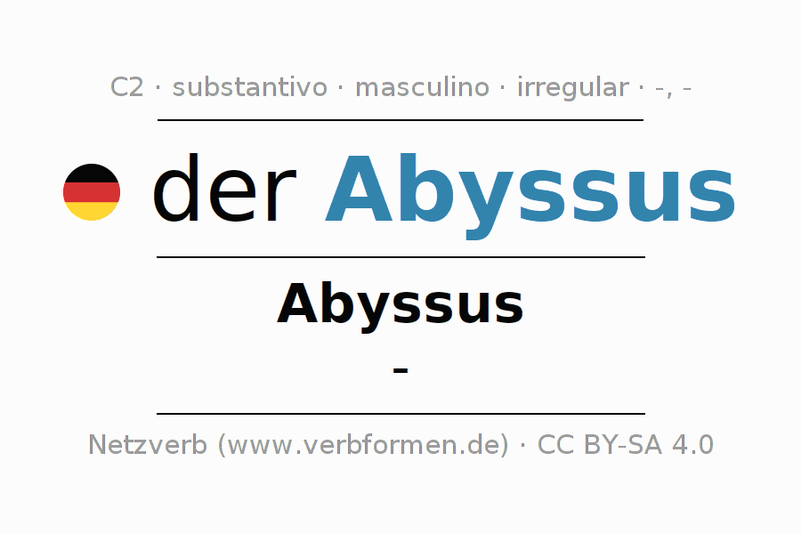 A declinação do substantivo Abyssus (abismo, inferno) está no genitivo singular Abyssus e no nominativo plural - . O substantivo Abyssus é declinado com as terminações -/-. Não há formas no plural. O gênero gramatical de Abyssus é masculino e o artigo definido é 'der'. Não se pode somente declinar o substantivo Abyssus mas sim todos os substantivos em alemão. O substantivo faz parte do vocabulário referente ao Certificado em Alemão do Nível C2. Comentários ☆