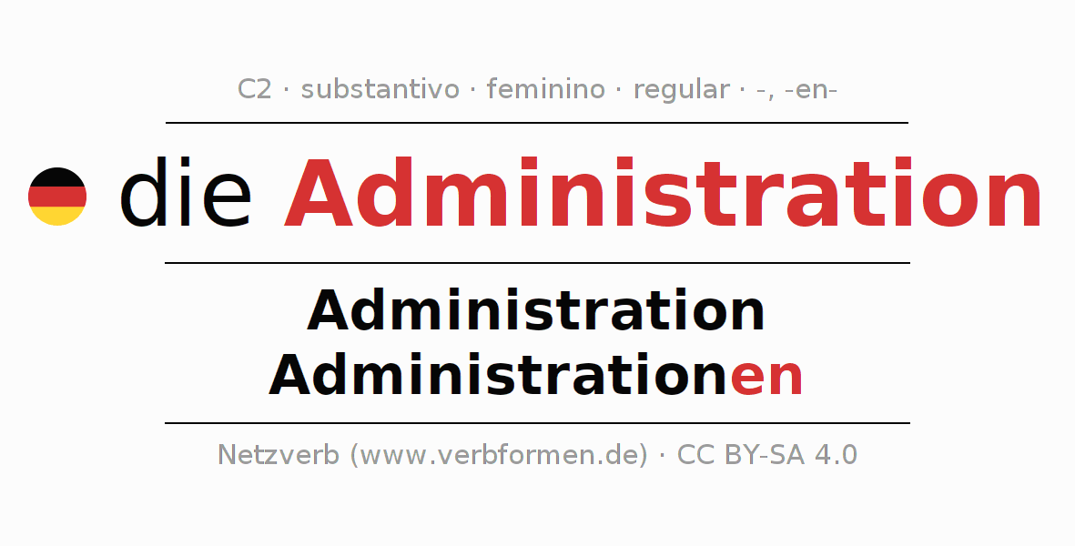 Declinação de Administration é apresentada em uma tabela com todas as formas no singular e no plural (plural) e em todos os quatro casos: nominativo (1º caso), genitivo (2º caso), dativo (3º caso) e acusativo (4º caso) . Especialmente para os alunos de alemão, a correta declinação da palavra Administration é fundamental.