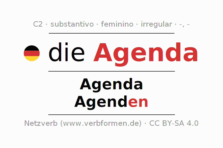 - Singular: die Agenda, der Agenda, der Agenda, die Agenda