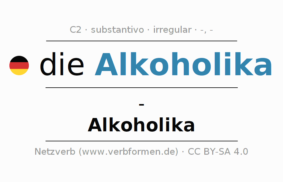 A declinação do substantivo Alkoholika (bebidas alcoólicas, bebidas espirituosas) está no genitivo singular - e no nominativo plural Alkoholika . O substantivo Alkoholika é declinado com as terminações /a. Não há formas no singular. O substantivo também pode ser usado com outros géneros e outros artigos. Não se pode somente declinar o substantivo Alkoholika mas sim todos os substantivos em alemão. O substantivo faz parte do vocabulário referente ao Certificado em Alemão do Nível C2. Comentários ☆