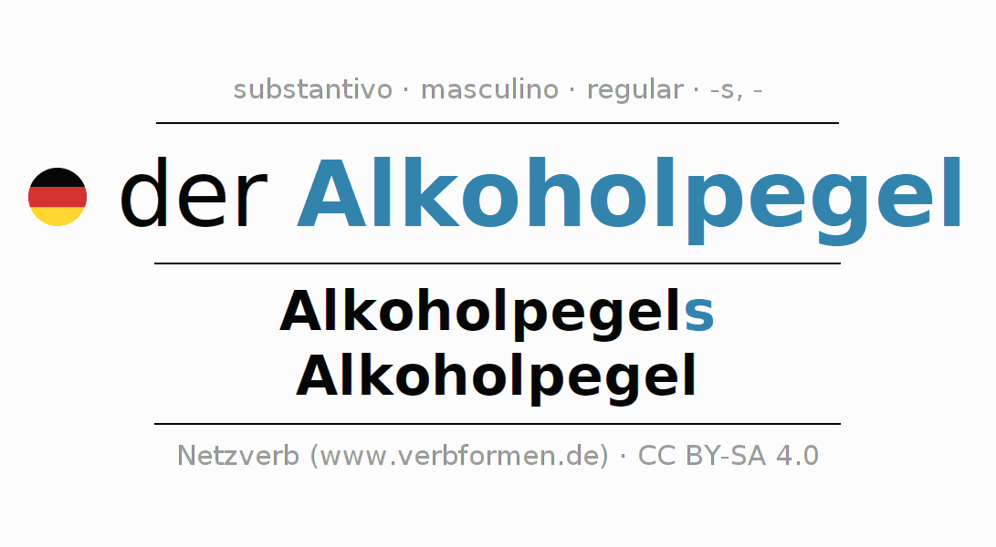 A declinação do substantivo Alkoholpegel (alcoolemia, alcoolémia) está no genitivo singular Alkoholpegels e no nominativo plural Alkoholpegel . O substantivo forte Alkoholpegel é declinado com a terminação s/-. O gênero gramatical de Alkoholpegel é masculino e o artigo definido é 'der'. Não se pode somente declinar o substantivo Alkoholpegel mas sim todos os substantivos em alemão. Comentários ☆