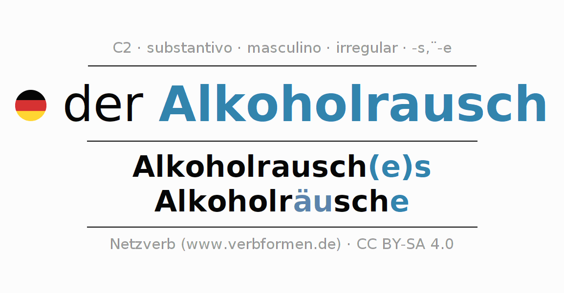 Declinação de Alkoholrausch é apresentada em uma tabela com todas as formas no singular e no plural (plural) e em todos os quatro casos: nominativo (1º caso), genitivo (2º caso), dativo (3º caso) e acusativo (4º caso) . Especialmente para os alunos de alemão, a correta declinação da palavra Alkoholrausch é fundamental.