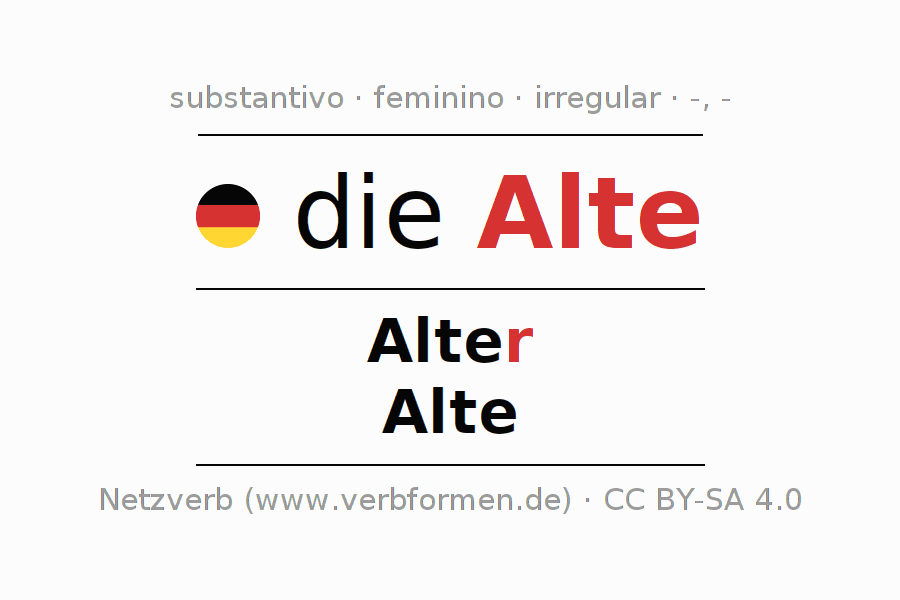 A declinação do substantivo Alte está no genitivo singular Alter e no nominativo plural Alte . O substantivo Alte é declinado com as terminações -/-. O gênero gramatical de Alte é feminino e o artigo definido é "die". O substantivo também pode ser usado com outros géneros e outros artigos. Não se pode somente declinar o substantivo Alte mas sim todos os substantivos em alemão. Comentários ☆