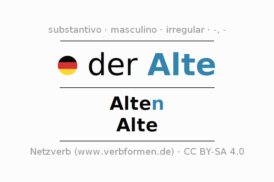 Declinação de der Alte é apresentada em uma tabela com todas as formas no singular e no plural (plural) e em todos os quatro casos: nominativo (1º caso), genitivo (2º caso), dativo (3º caso) e acusativo (4º caso) . Especialmente para os alunos de alemão, a correta declinação da palavra der Alte é fundamental.