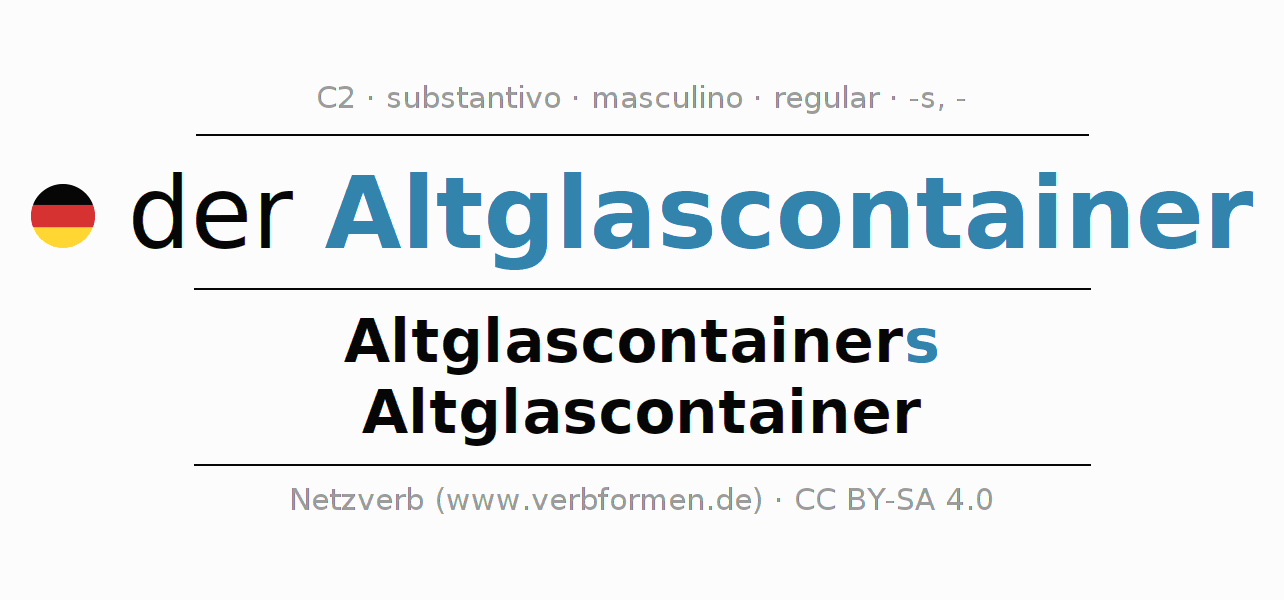 - Singular: der Altglascontainer, des Altglascontainers, dem Altglascontainer, den Altglascontainer