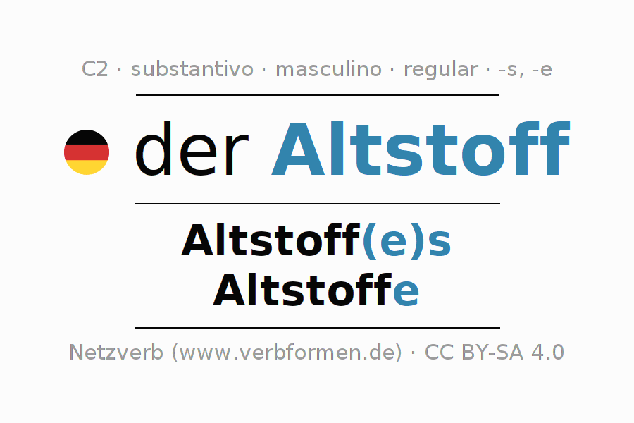 Declinação de Altstoff é apresentada em uma tabela com todas as formas no singular e no plural (plural) e em todos os quatro casos: nominativo (1º caso), genitivo (2º caso), dativo (3º caso) e acusativo (4º caso) . Especialmente para os alunos de alemão, a correta declinação da palavra Altstoff é fundamental.