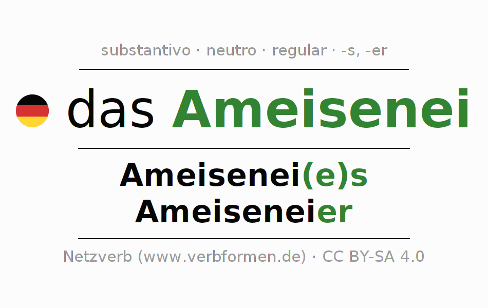 A declinação do substantivo Ameisenei (ovo de formiga) está no genitivo singular Ameisenei(e)s e no nominativo plural Ameiseneier . O substantivo forte Ameisenei é declinado com a terminação es/er. O gênero gramatical de Ameisenei é neutro e o artigo definido é "das". Não se pode somente declinar o substantivo Ameisenei mas sim todos os substantivos em alemão. Comentários ☆