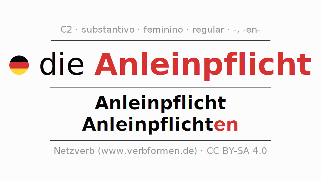Declinação de Anleinpflicht é apresentada em uma tabela com todas as formas no singular e no plural (plural) e em todos os quatro casos: nominativo (1º caso), genitivo (2º caso), dativo (3º caso) e acusativo (4º caso) . Especialmente para os alunos de alemão, a correta declinação da palavra Anleinpflicht é fundamental.