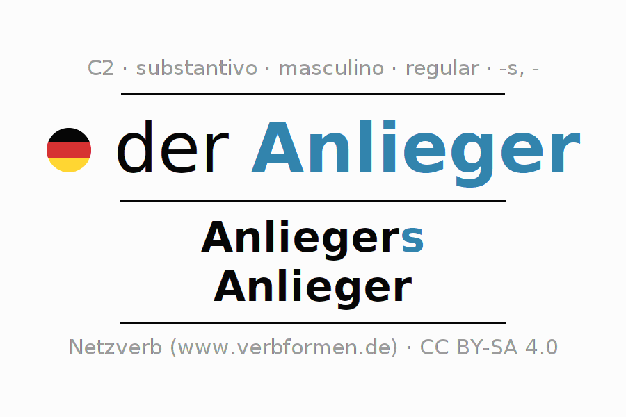 A declinação do substantivo Anlieger (morador, proprietário adjacente) está no genitivo singular Anliegers e no nominativo plural Anlieger . O substantivo forte Anlieger é declinado com a terminação s/-. O gênero gramatical de Anlieger é masculino e o artigo definido é 'der'. Não se pode somente declinar o substantivo Anlieger mas sim todos os substantivos em alemão. O substantivo faz parte do vocabulário referente ao Certificado em Alemão do Nível C2. Comentários ☆